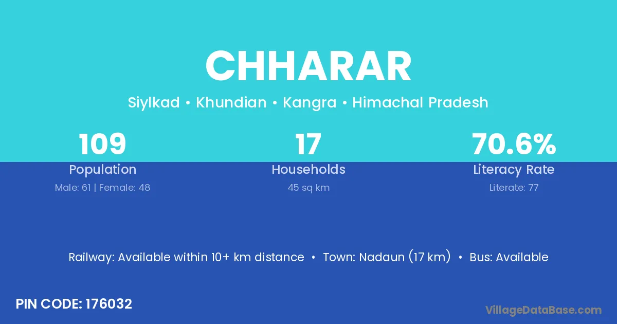 Nadaun (17 km) is the nearest town to Chharar village for major economic activities and is located approximately 17 km away.