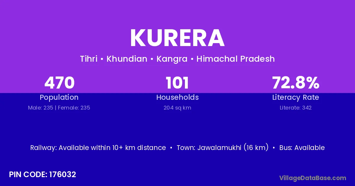 Jawalamukhi (16 km) is the nearest town to Kurera village for major economic activities and is located approximately 16 km away.