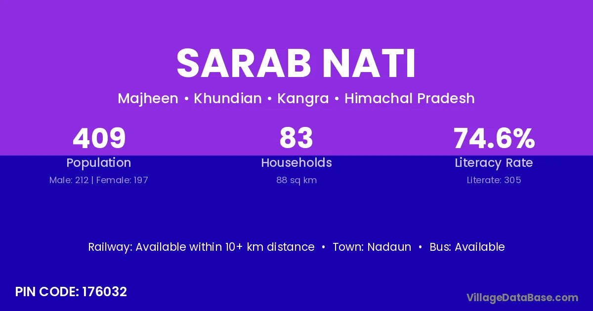 Sarab Nati village has a total population of 409 people, of which 212 are males and 197 are females.