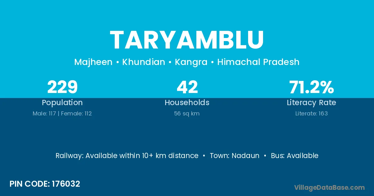 Taryamblu village has a total population of 229 people, of which 117 are males and 112 are females.
