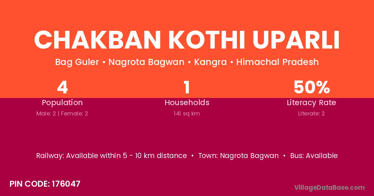 Chakban Kothi Uparli village has a total population of 4 people, of which 2 are males and 2 are females.