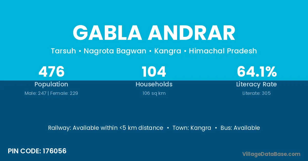 Kangra is the nearest town to Gabla Andrar village for major economic activities