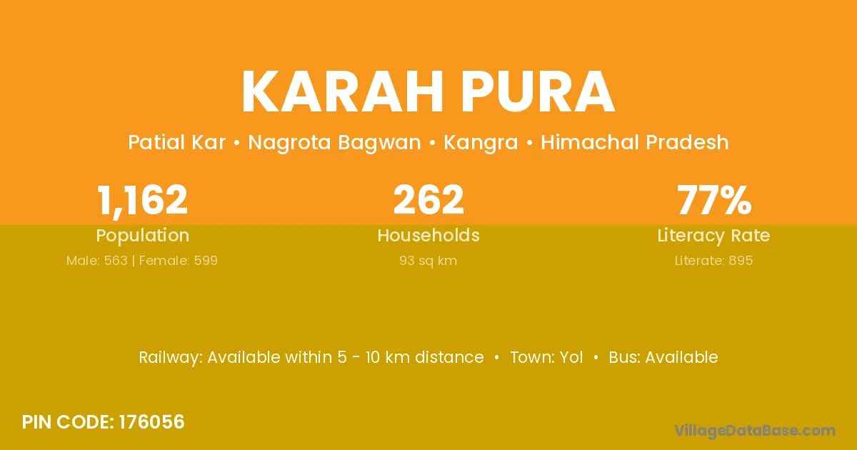 Karah Pura village has a total population of 1,162 people, of which 563 are males and 599 are females.