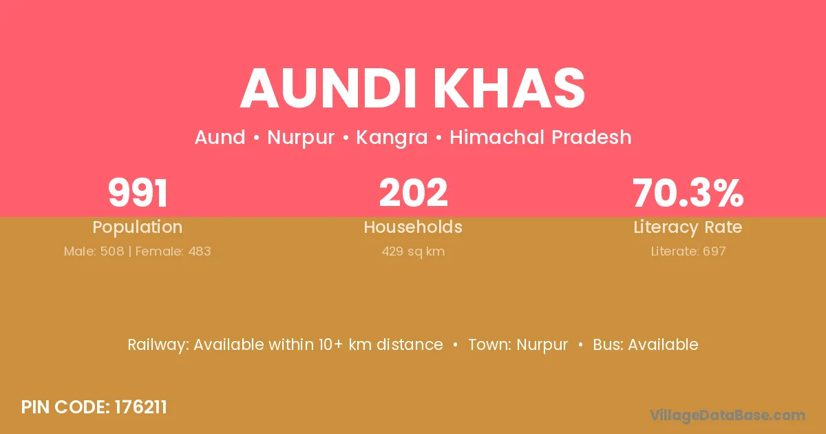 Aundi Khas village has a total population of 991 people, of which 508 are males and 483 are females.
