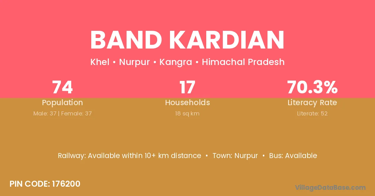 Band Kardian village has a total population of 74 people, of which 37 are males and 37 are females.