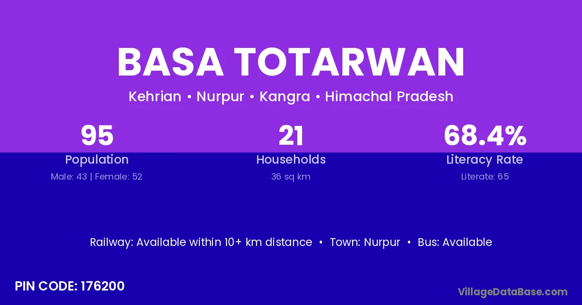 Basa Totarwan village has a total population of 95 people, of which 43 are males and 52 are females.