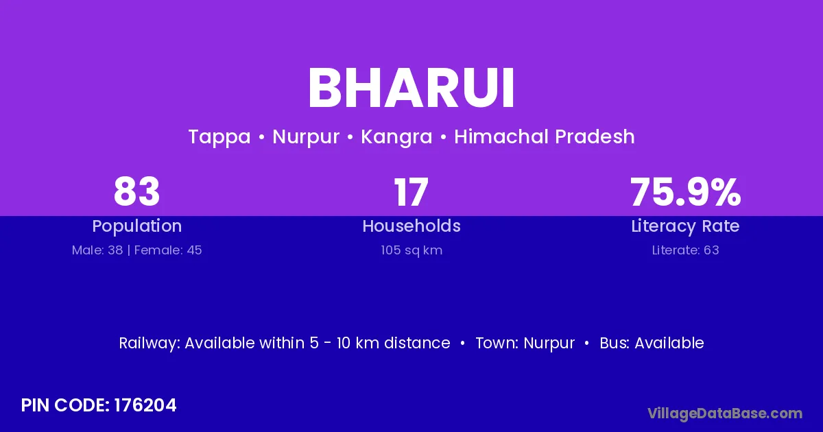 Bharui village has a total population of 83 people, of which 38 are males and 45 are females.