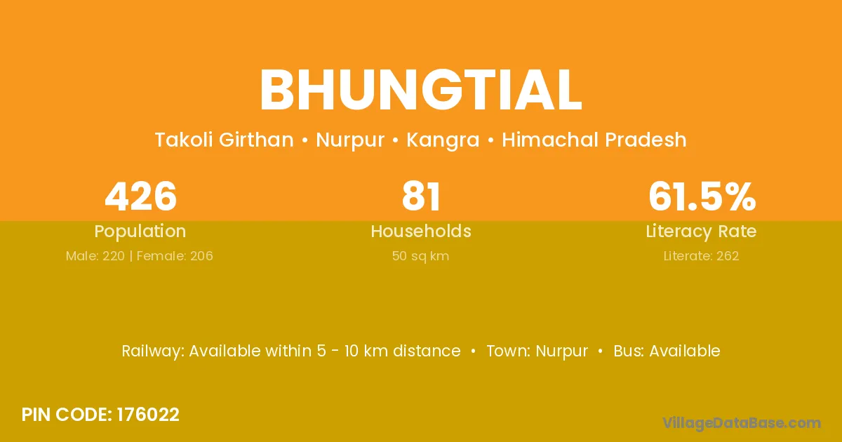 Bhungtial village has a total population of 426 people, of which 220 are males and 206 are females.