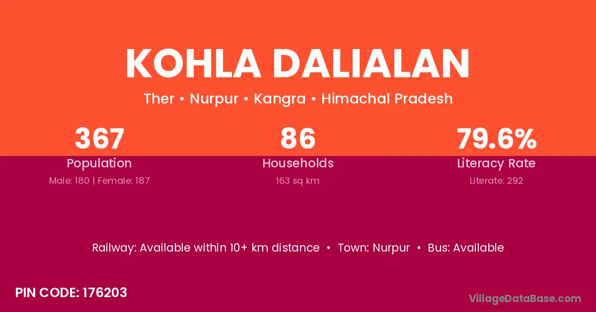 Kohla Dalialan village has a total population of 367 people, of which 180 are males and 187 are females.