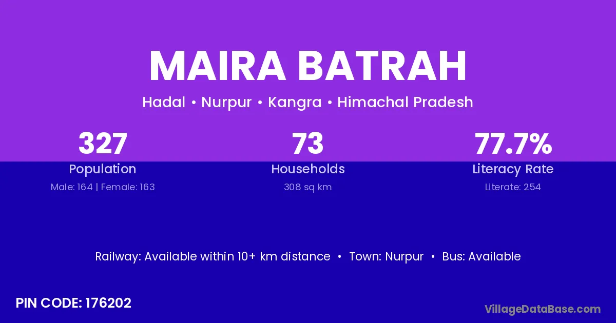 According to Census 2011 information, the village code of Maira Batrah village is 176202.