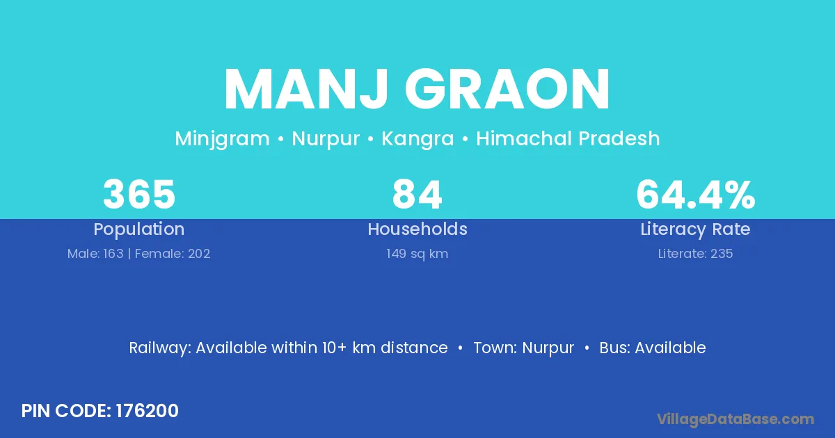 Manj Graon village has a total population of 365 people, of which 163 are males and 202 are females.