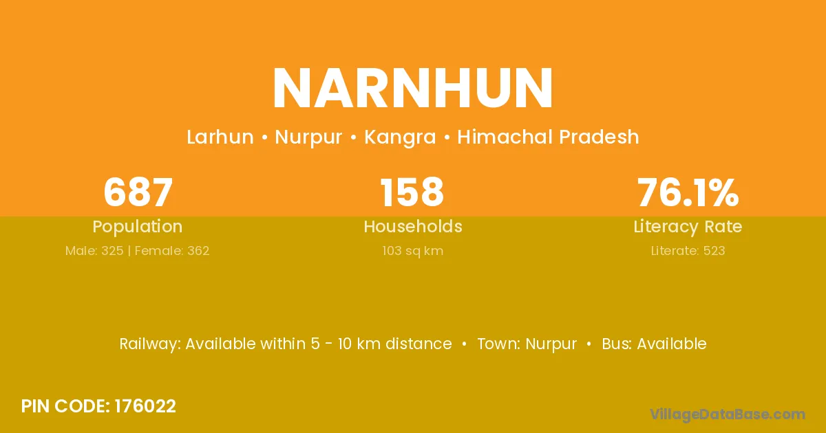 Narnhun village has a total population of 687 people, of which 325 are males and 362 are females.