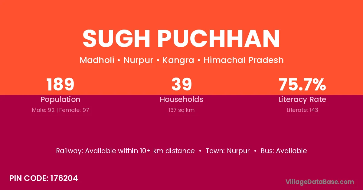 Sugh Puchhan village has a total population of 189 people, of which 92 are males and 97 are females.