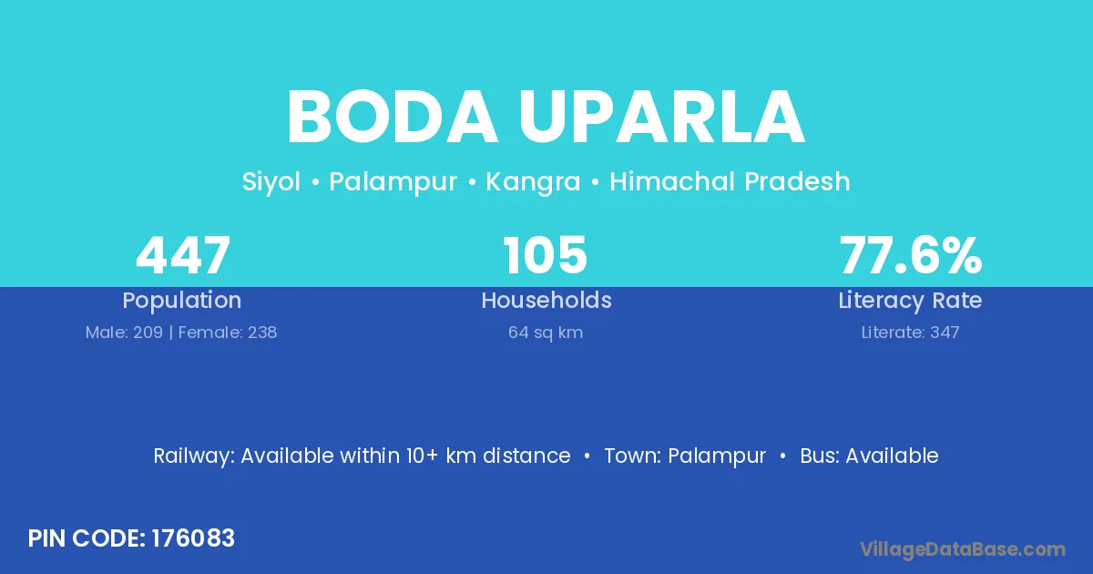 Palampur is the nearest town to Boda Uparla village for major economic activities