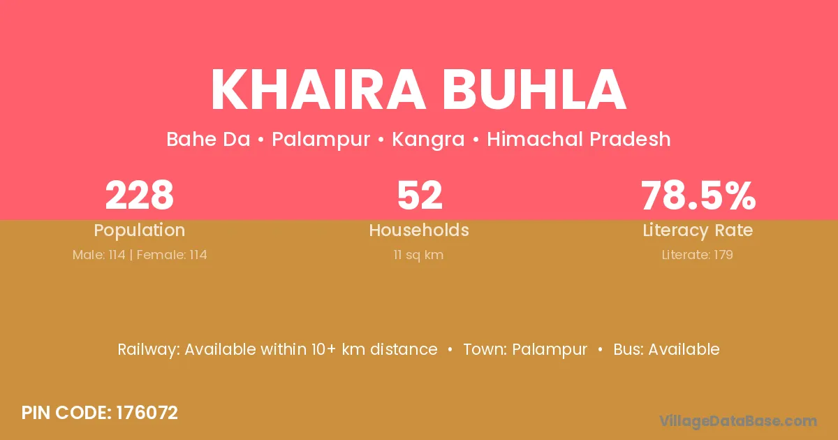 Khaira Buhla village has a total population of 228 people, of which 114 are males and 114 are females.