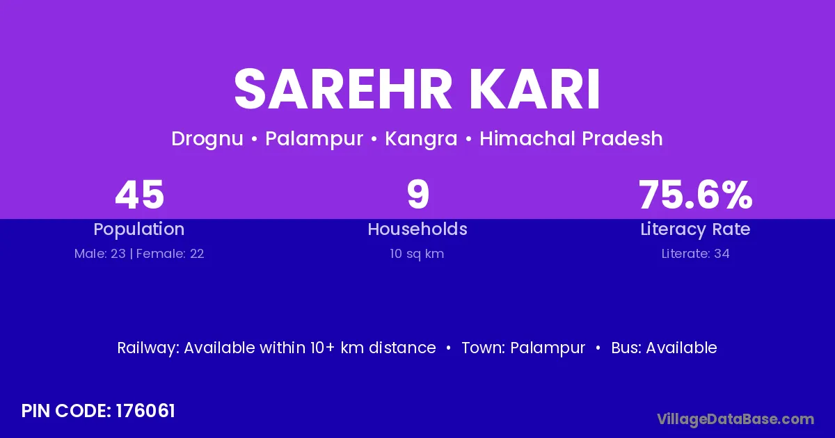 Palampur is the nearest town to Sarehr Kari village for major economic activities