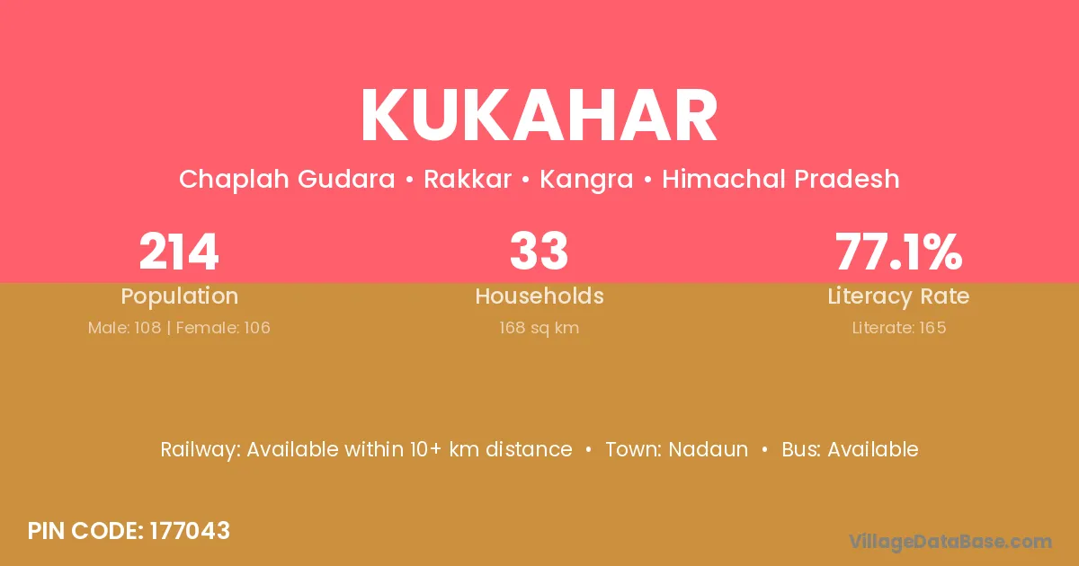 Kukahar village has a total population of 214 people, of which 108 are males and 106 are females.