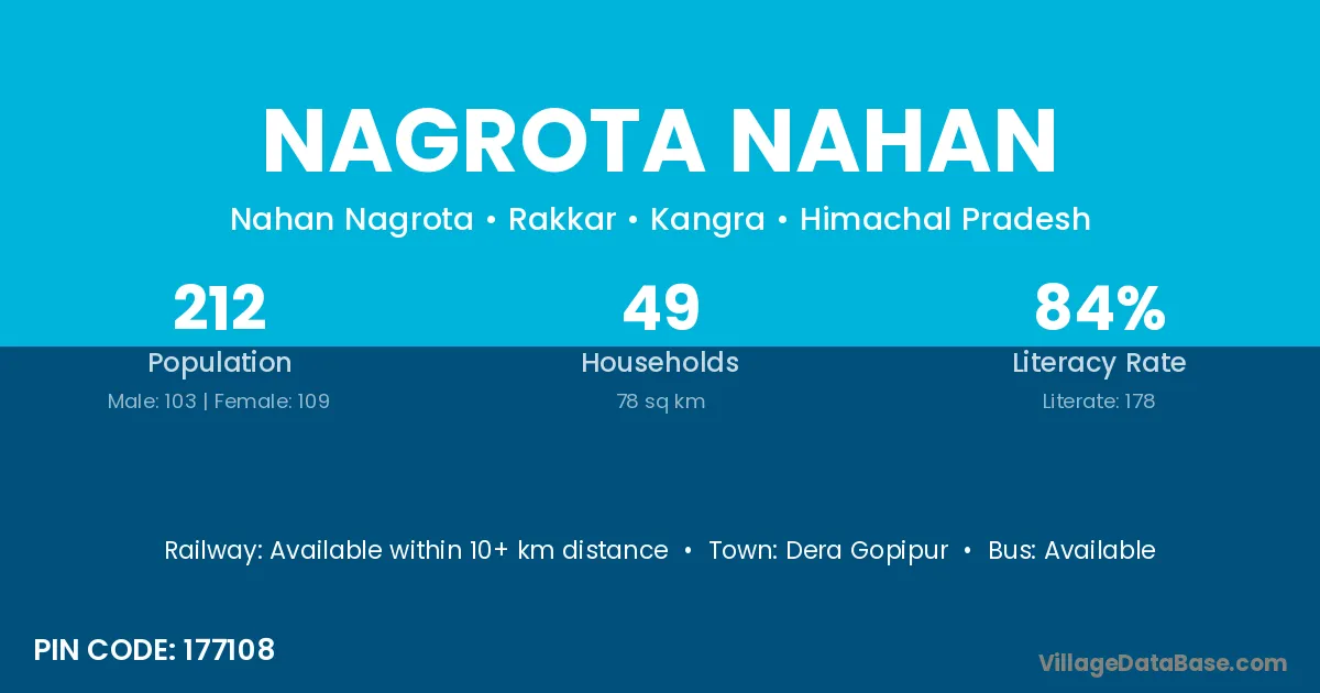 Nagrota Nahan village has a total population of 212 people, of which 103 are males and 109 are females.