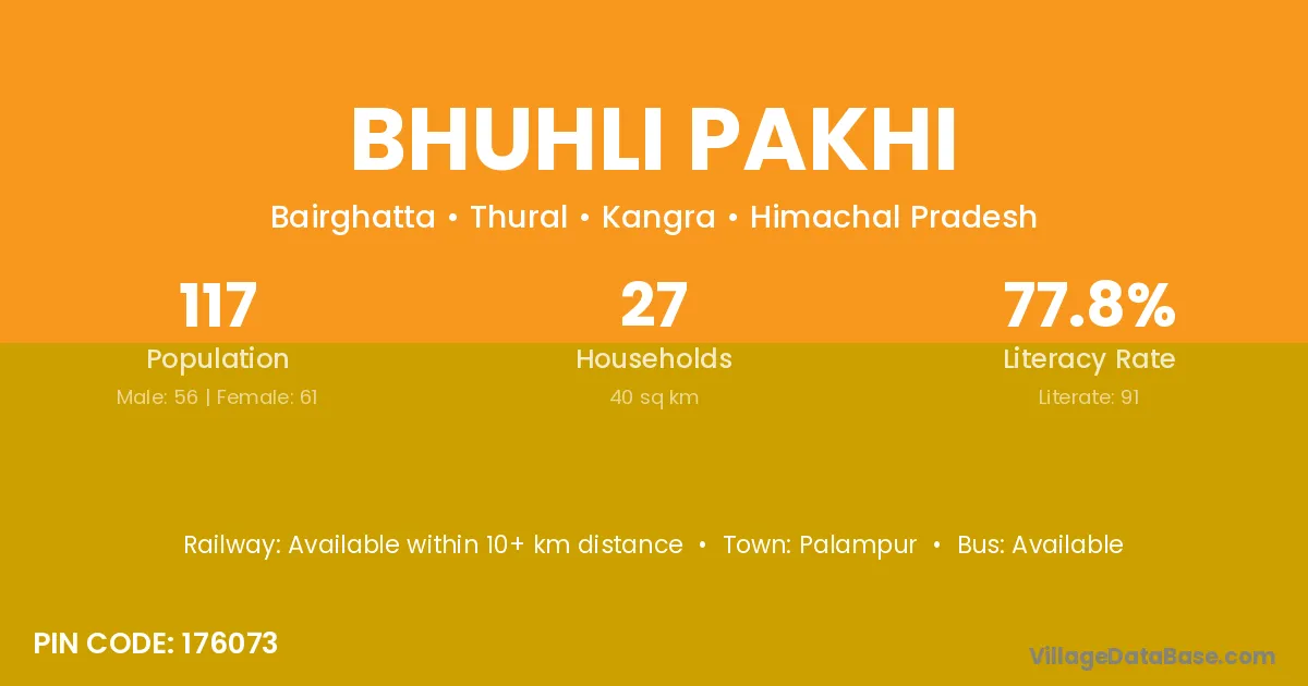 Bhuhli Pakhi village has a total population of 117 people, of which 56 are males and 61 are females.