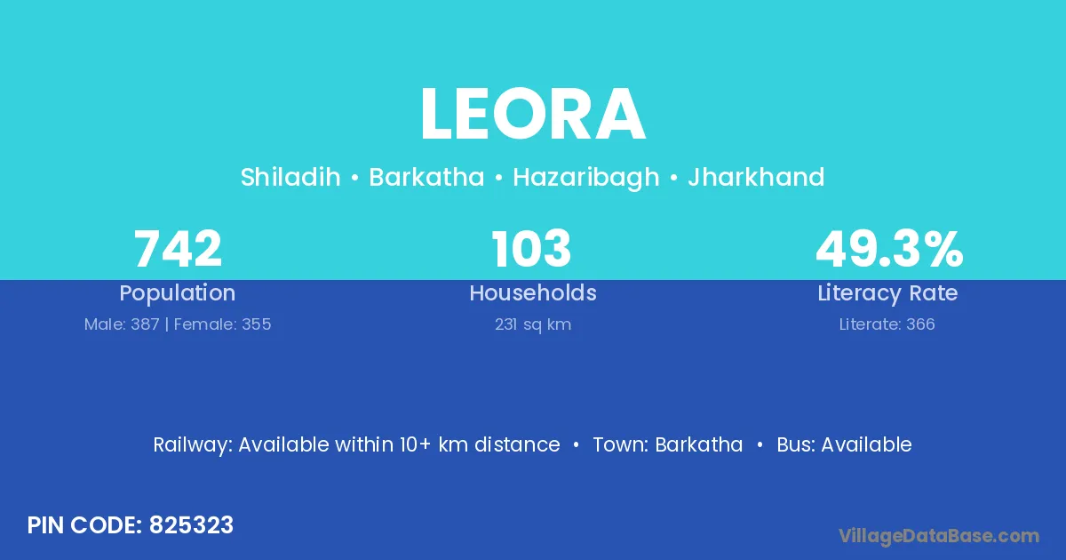 The literacy rate of Leora village is 79.17%. Male literacy stands at 80.49% and female literacy at 78.18%.