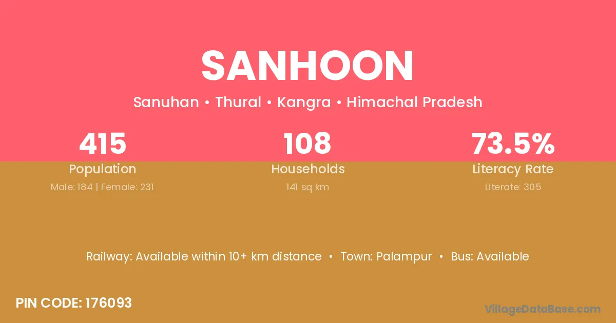 Sanhoon village has a total population of 415 people, of which 184 are males and 231 are females.