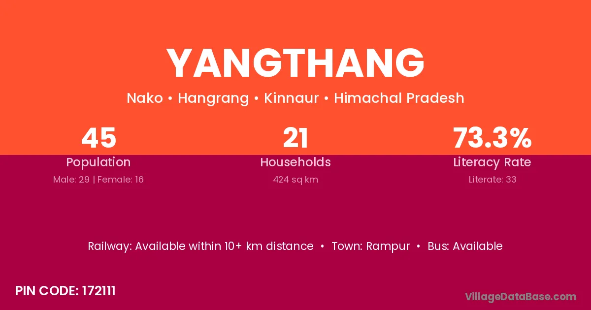 Yangthang village has a total population of 45 people, of which 29 are males and 16 are females.
