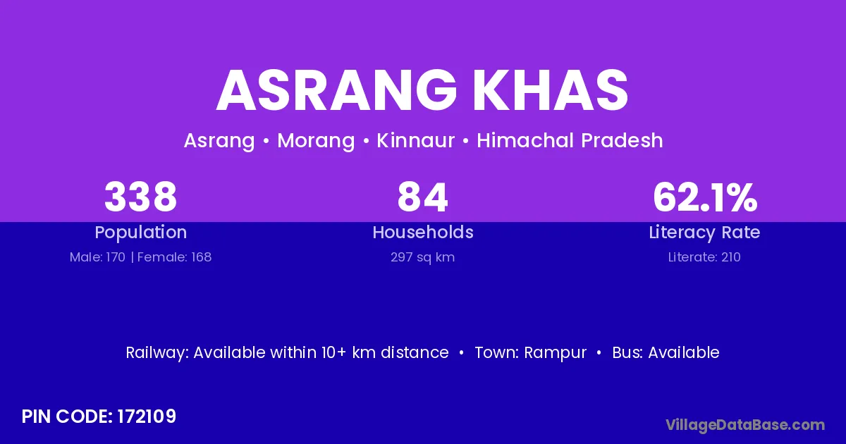 Asrang Khas village has a total population of 338 people, of which 170 are males and 168 are females.