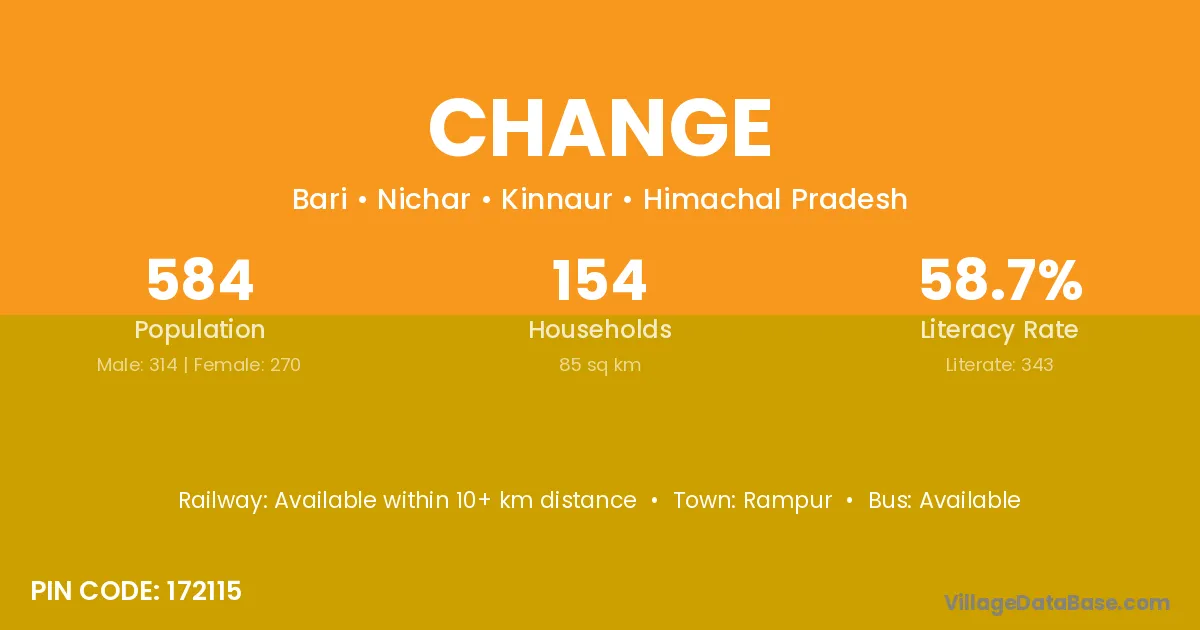 The literacy rate of Change village is 58.73%. Male literacy stands at 67.20% and female literacy at 48.89%.