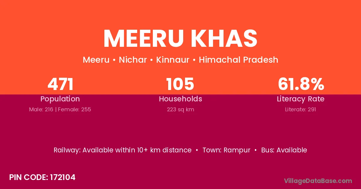 Meeru Khas village has a total population of 471 people, of which 216 are males and 255 are females.
