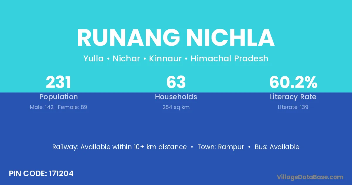 Runang Nichla village has a total population of 231 people, of which 142 are males and 89 are females.