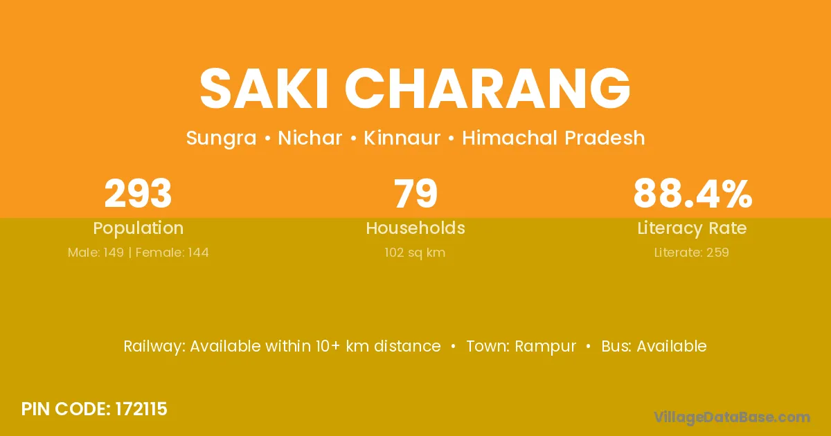 Saki Charang village has a total population of 293 people, of which 149 are males and 144 are females.