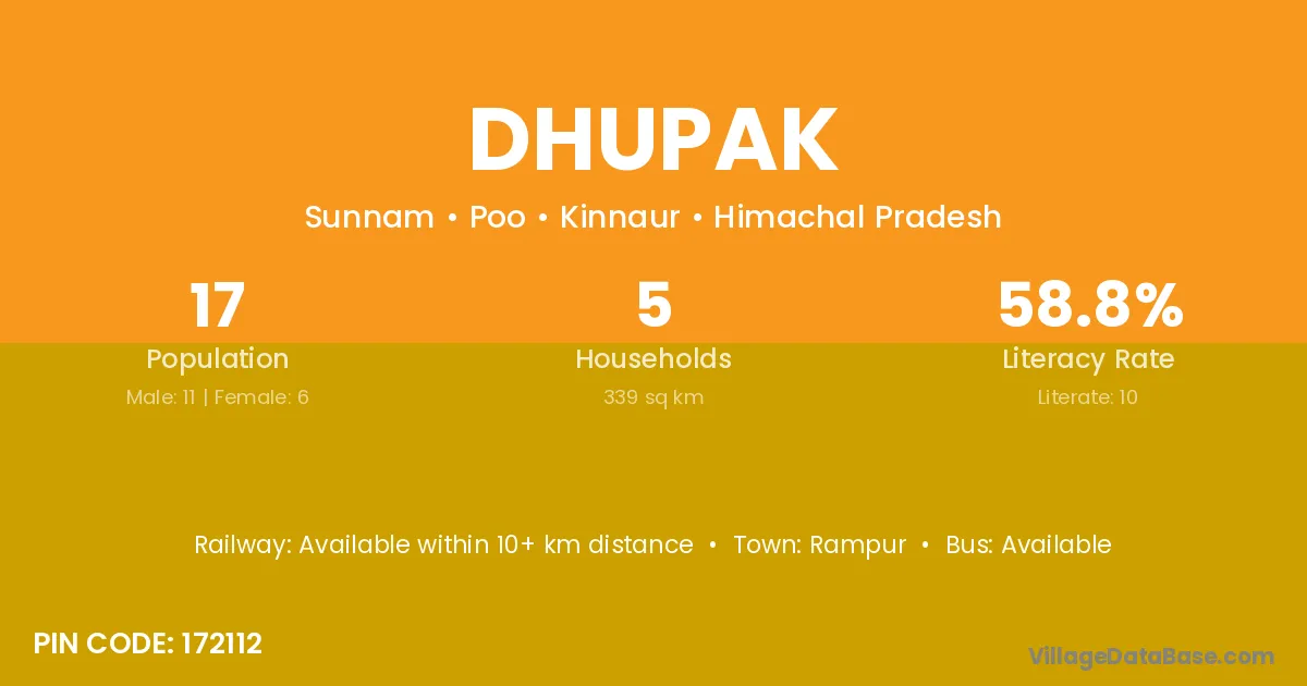Dhupak village has a total population of 17 people, of which 11 are males and 6 are females.