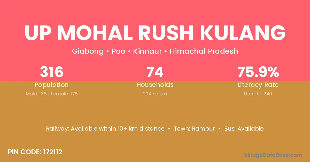 Up Mohal Rush Kulang village has a total population of 316 people, of which 138 are males and 178 are females.