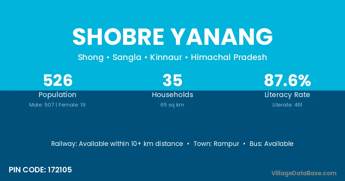 Shobre Yanang village has a total population of 526 people, of which 507 are males and 19 are females.