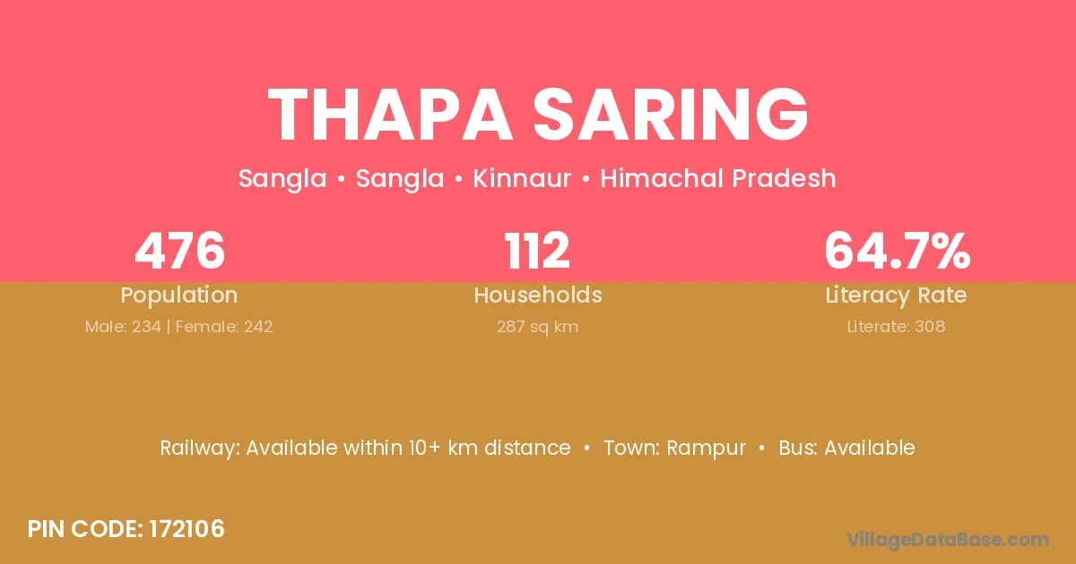 Thapa Saring village has a total population of 476 people, of which 234 are males and 242 are females.