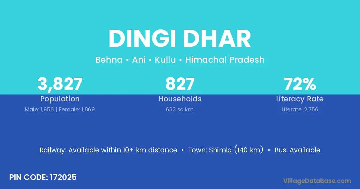 Shimla (140 km) is the nearest town to Dingi Dhar village for major economic activities and is located approximately 140 km away.