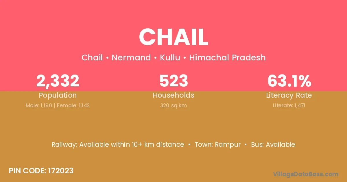 Chail village has a total population of 2,332 people, of which 1,190 are males and 1,142 are females.