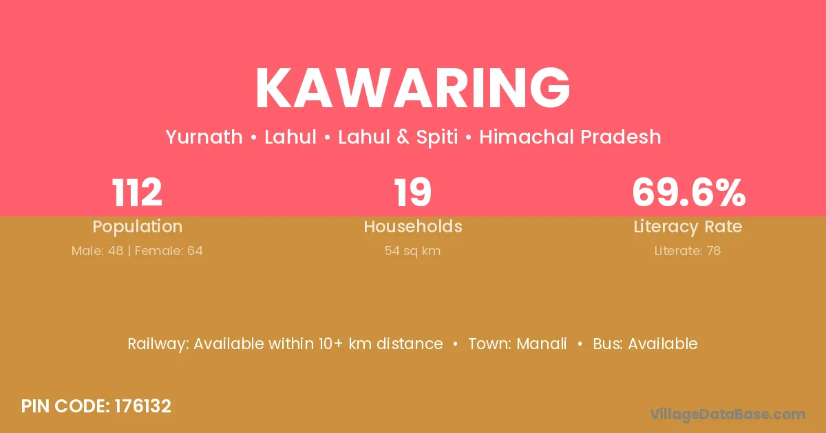 Kawaring village has a total population of 112 people, of which 48 are males and 64 are females.