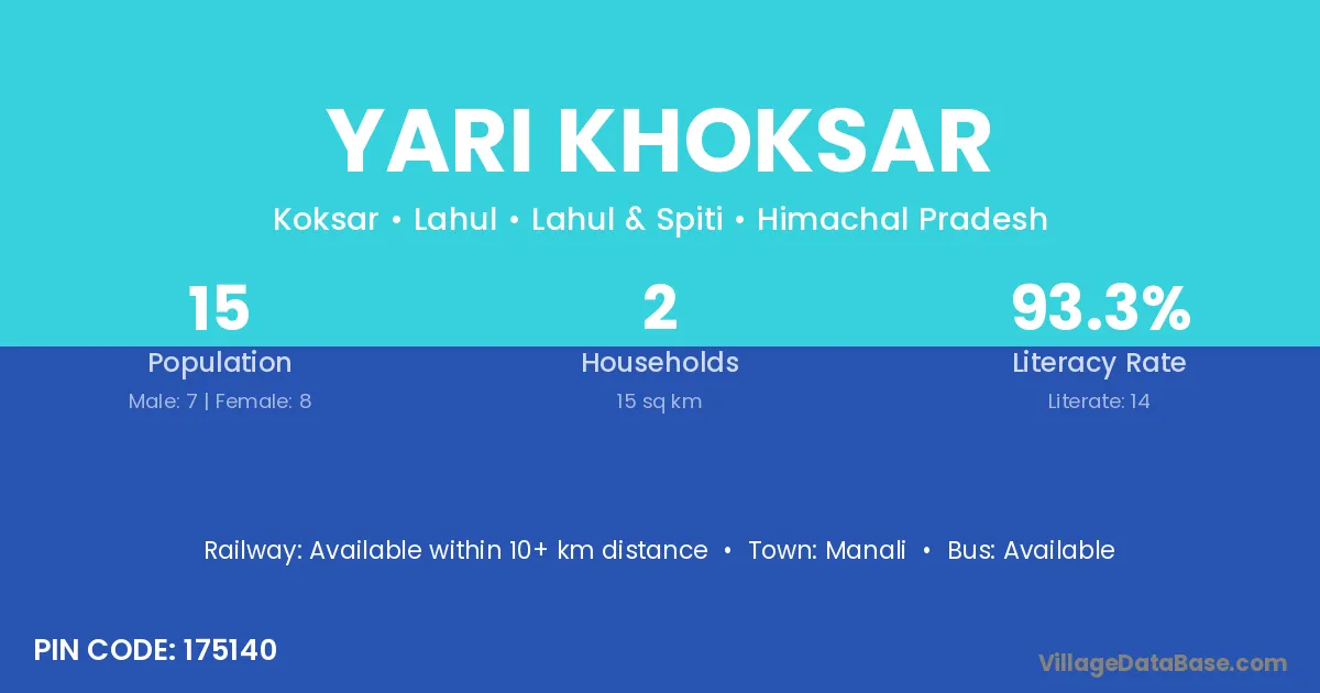 Yari Khoksar village has a total population of 15 people, of which 7 are males and 8 are females.