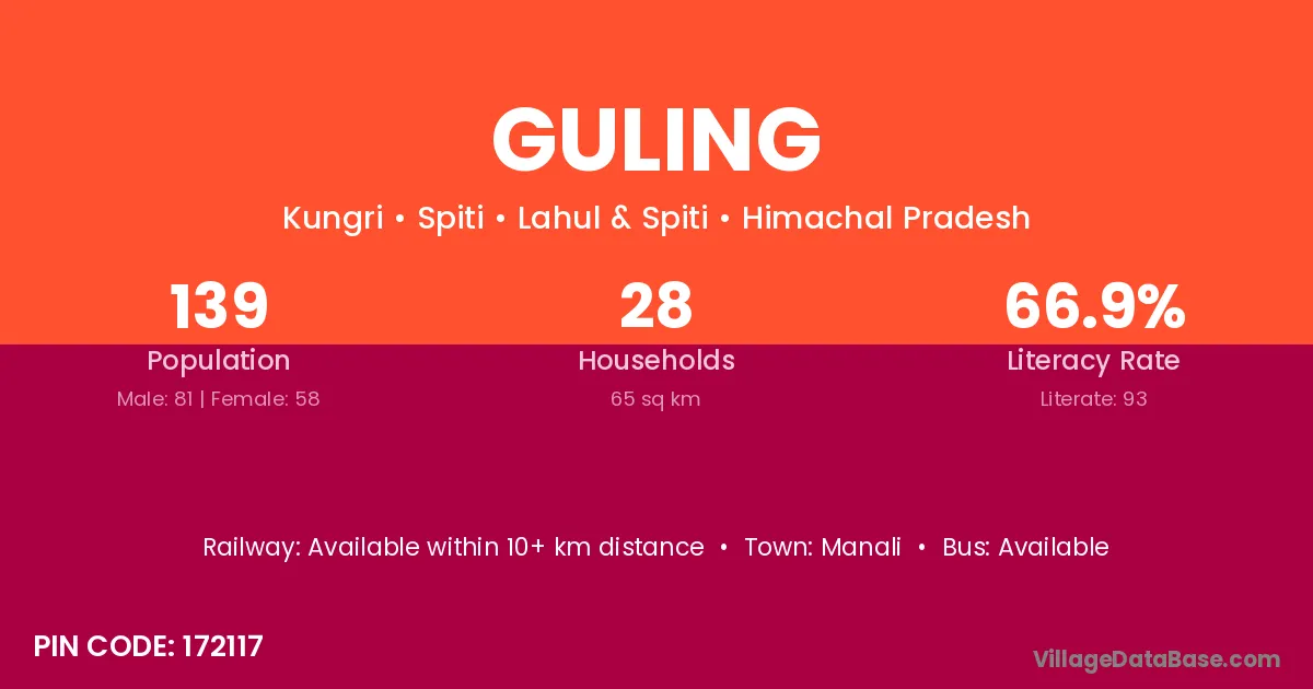 Guling village has a total population of 139 people, of which 81 are males and 58 are females.