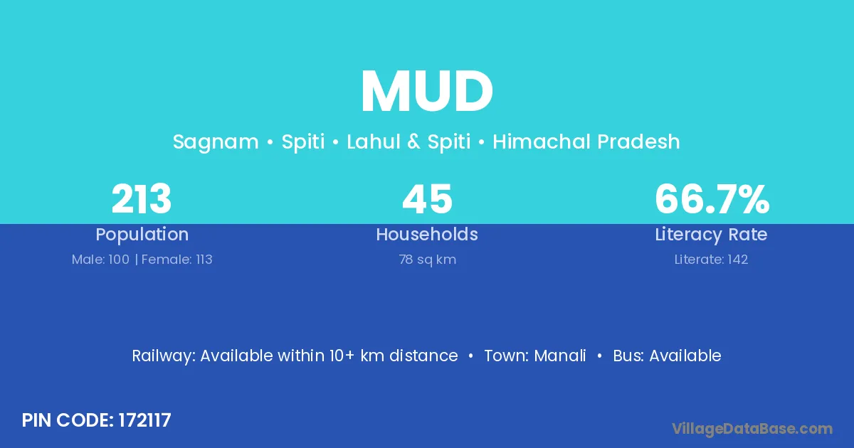 Mud village has a total population of 213 people, of which 100 are males and 113 are females.