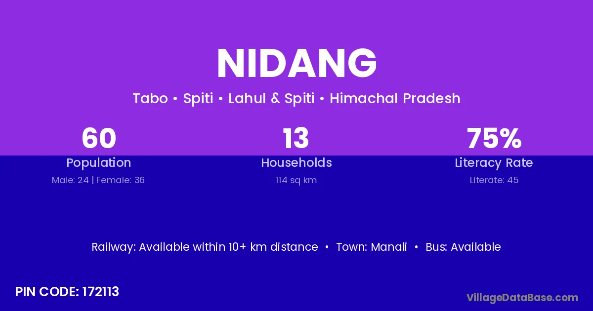 Nidang village has a total population of 60 people, of which 24 are males and 36 are females.