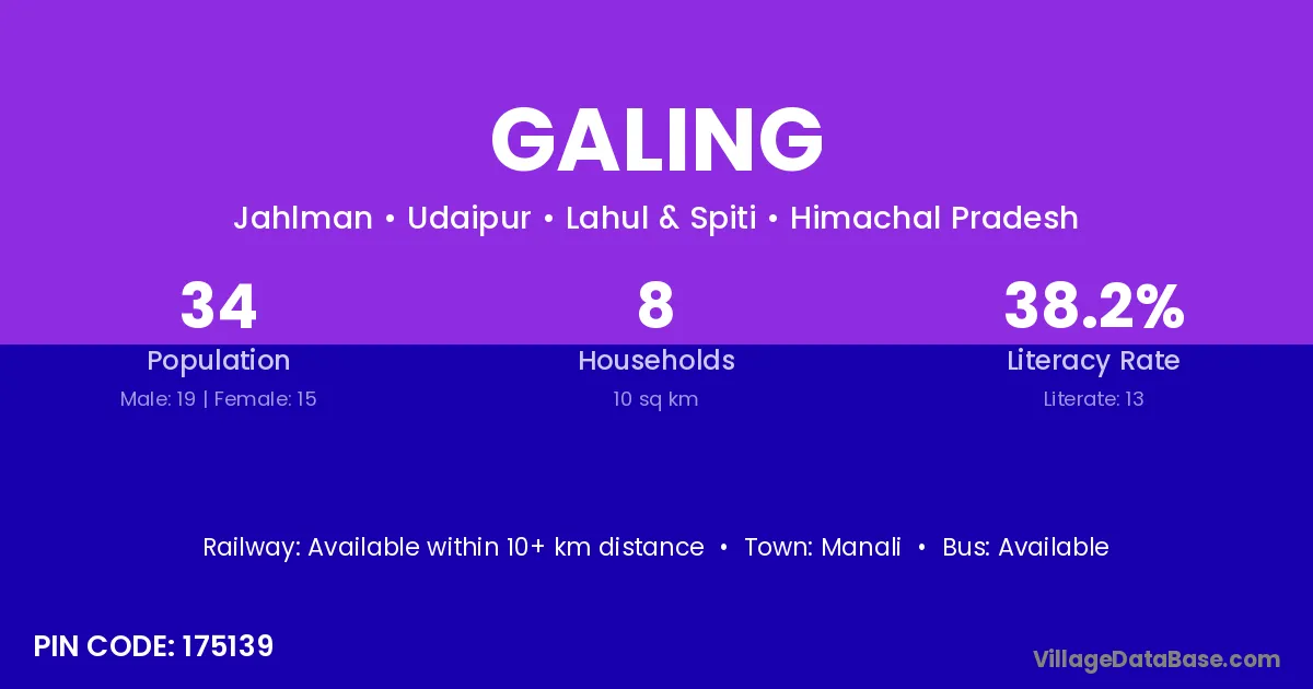 Galing village has a total population of 34 people, of which 19 are males and 15 are females.