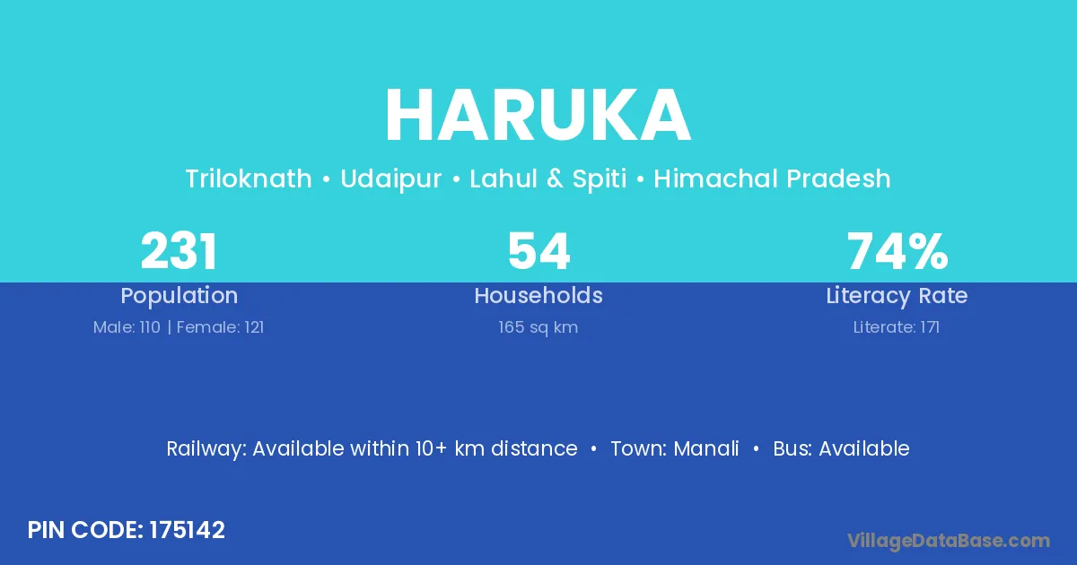 Haruka village has a total population of 231 people, of which 110 are males and 121 are females.