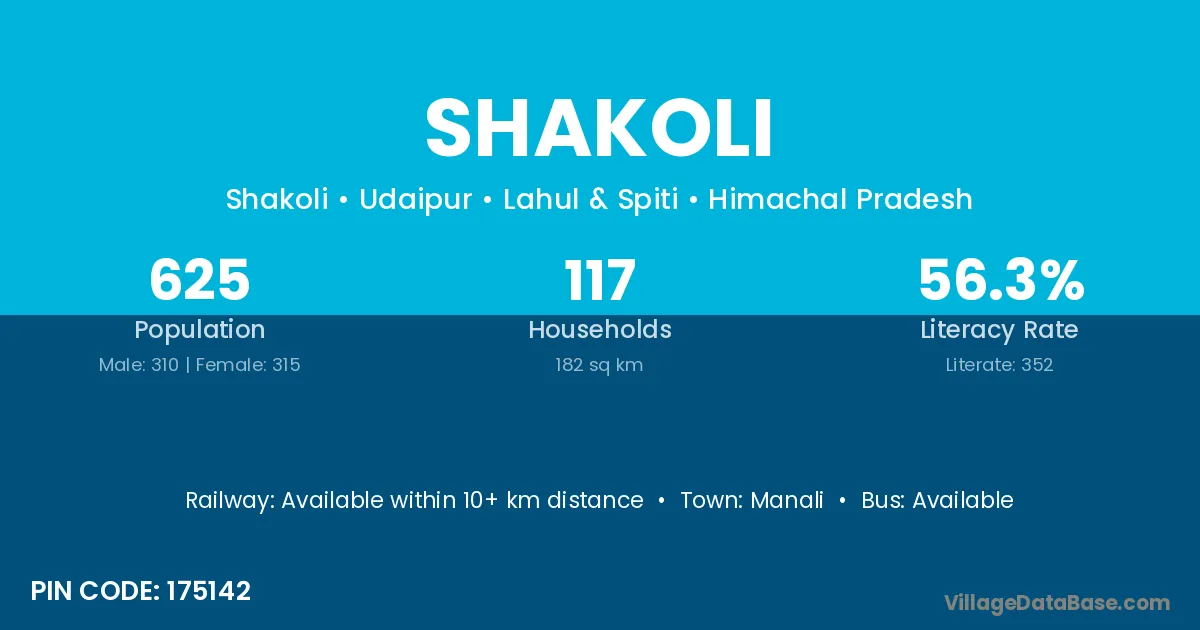 Shakoli village has a total population of 625 people, of which 310 are males and 315 are females.