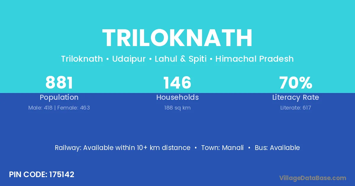 Triloknath village has a total population of 881 people, of which 418 are males and 463 are females.