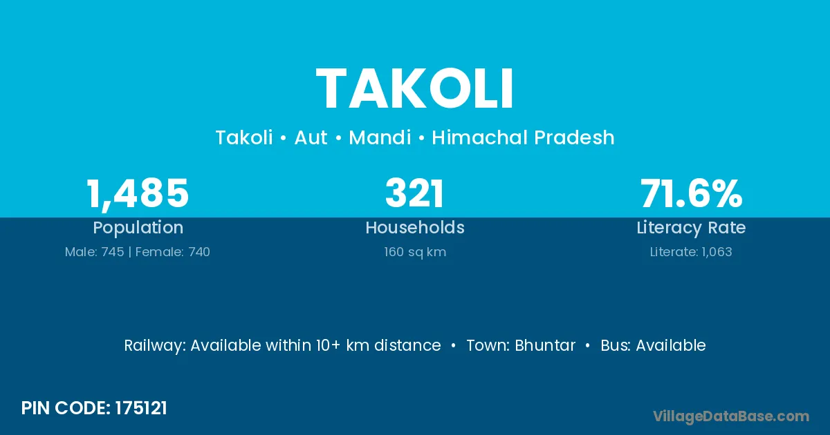 Takoli village has a total population of 1,485 people, of which 745 are males and 740 are females.