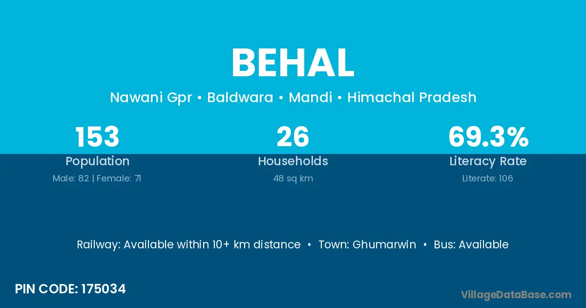 Behal village has a total population of 153 people, of which 82 are males and 71 are females.