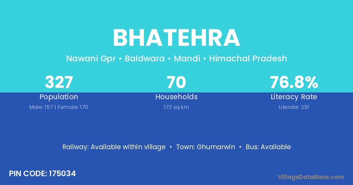 Bhatehra village has a total population of 327 people, of which 157 are males and 170 are females.