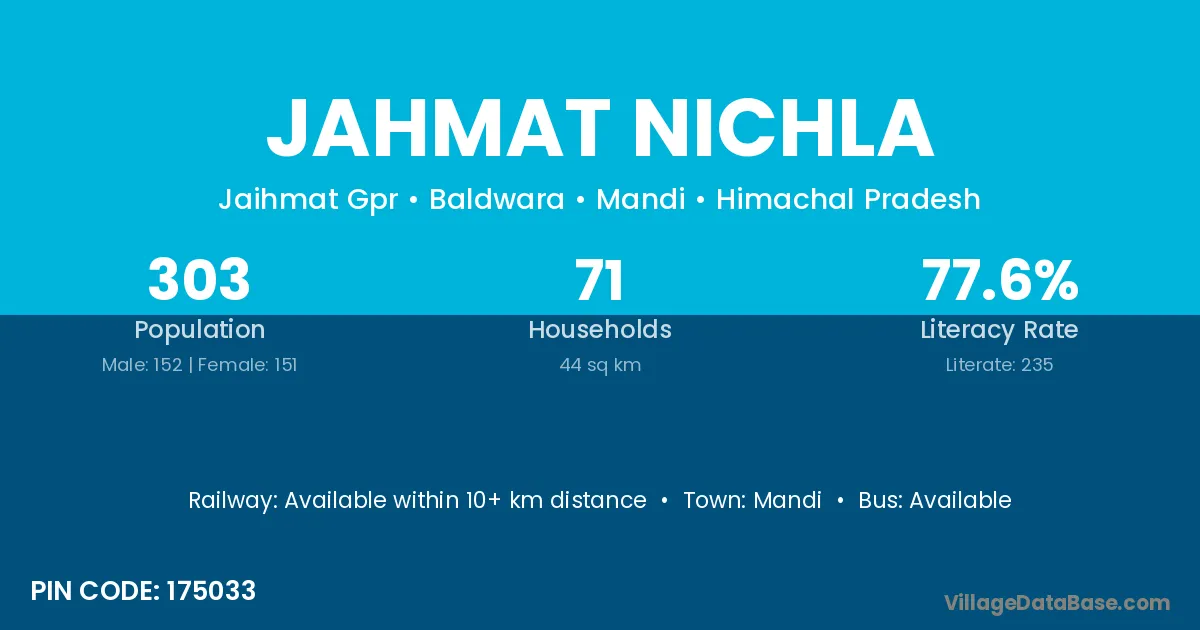 Jahmat Nichla village has a total population of 303 people, of which 152 are males and 151 are females.